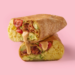 Scrambled eggs, swiss cheese, smoked bacon, cherry tomatoes, avocado, and chipotle aioli in a whole wheat tortilla.