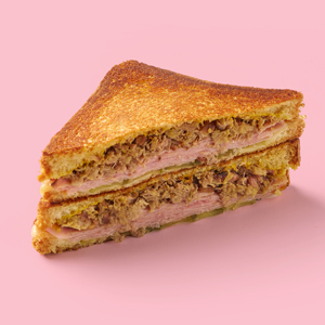 Lemon-pepper roasted pork, smoked ham, Swiss cheese, pickles, and honey mustard on toasted brioche or cuban bread