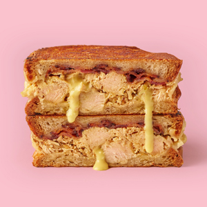Grilled chicken breast, Swiss cheese, smoked bacon, and honey mustard on toasted sourdough.