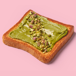 Toasted brioche topped with matcha milk jam and pistachio crunch.