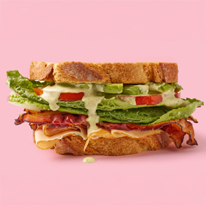 Roasted turkey, smoked bacon. romaine, tomato, avocado, and cilantro sauce on sourdough